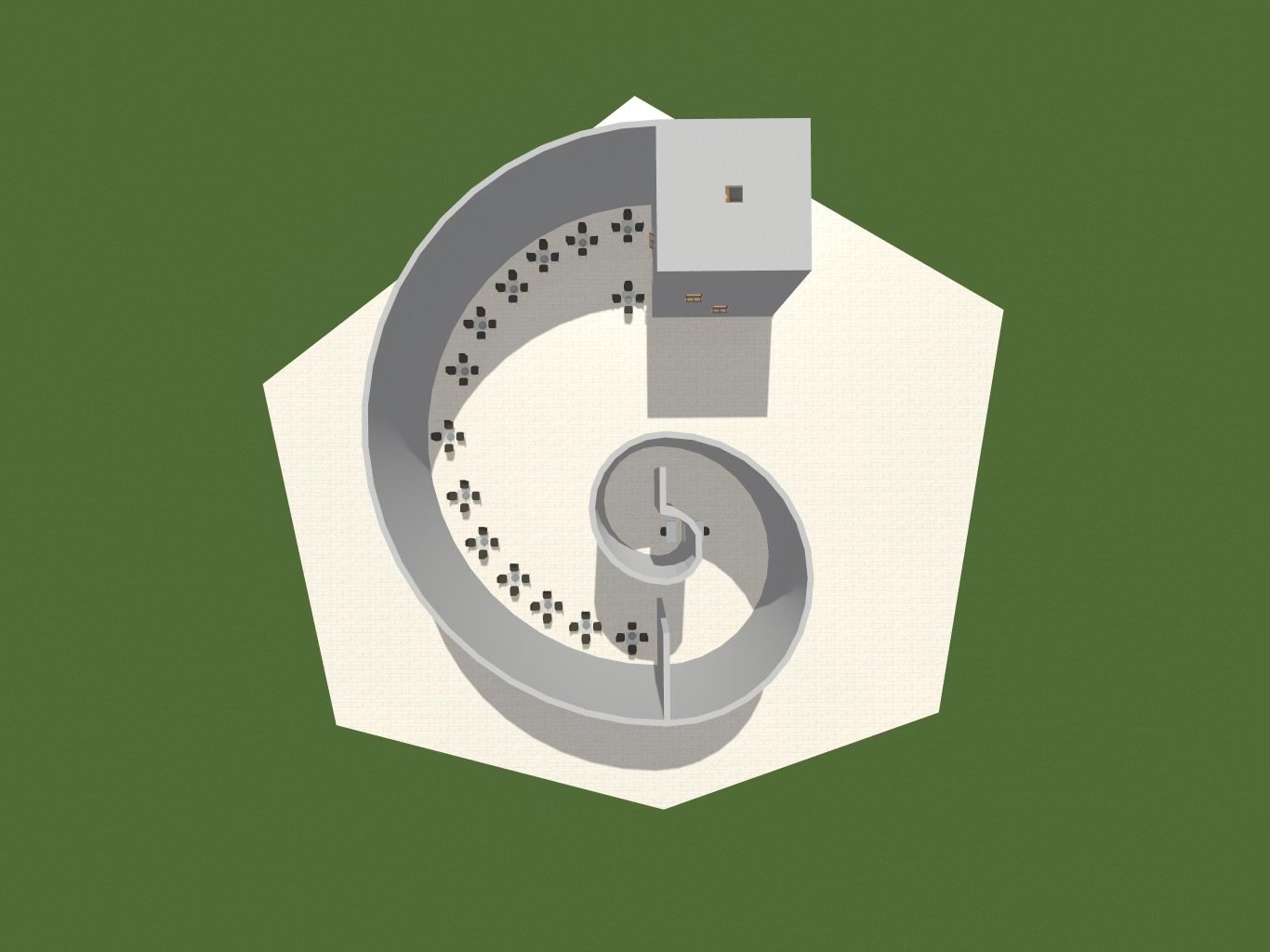 The Pavilion Challenge: I was challenged to use a circular wall and decided to create a restaurant that offered a great view from every seat as well as having a meeting area for chefs.