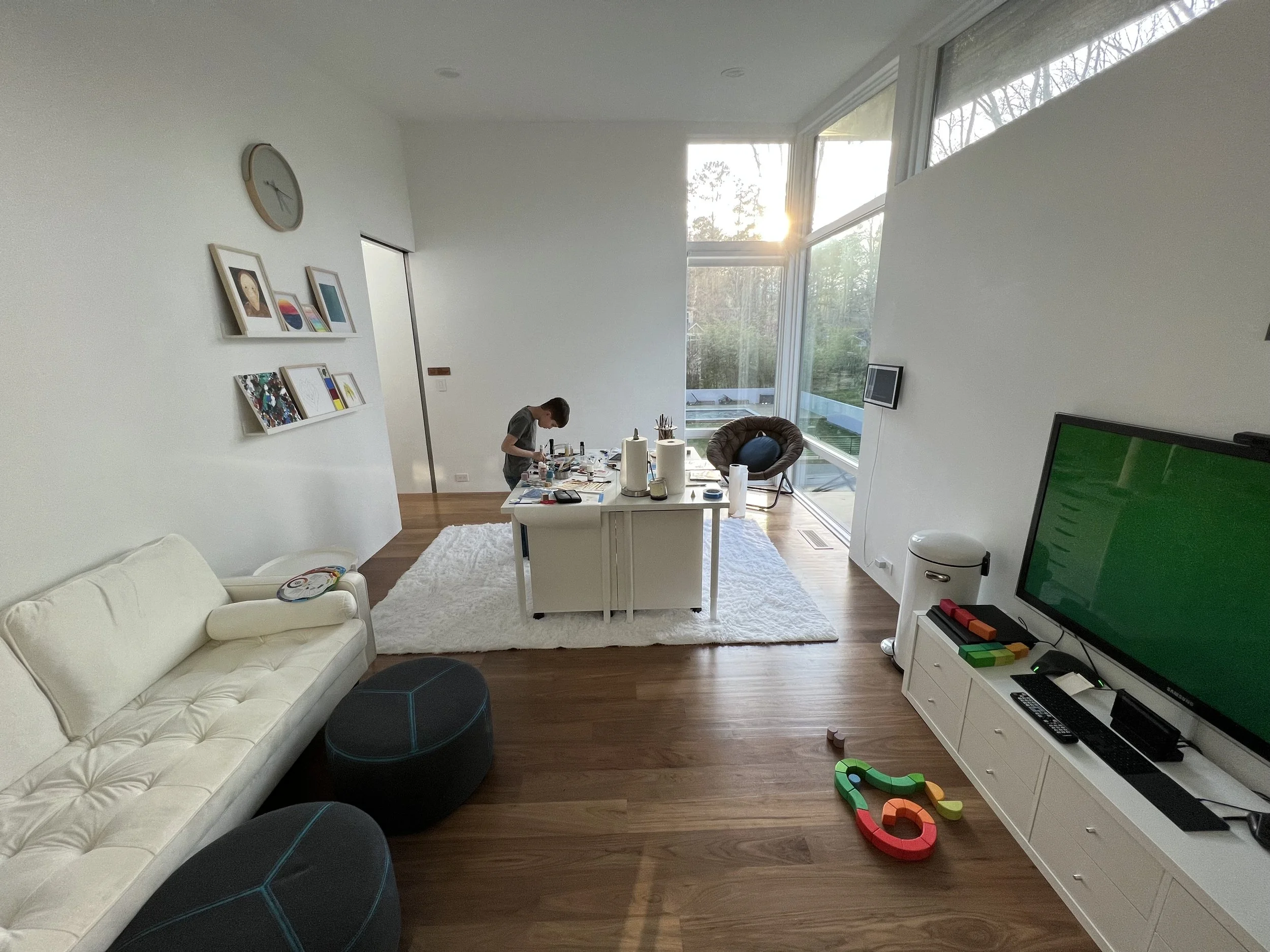 The finished studio offers a view of a beautiful forest and floods the room with natural light. The central table functions as a way to simply start painting on a beautiful surface. A cozy white velvet couch with a small table to the side of it allows for a comfortable seating area while the paint dries.
