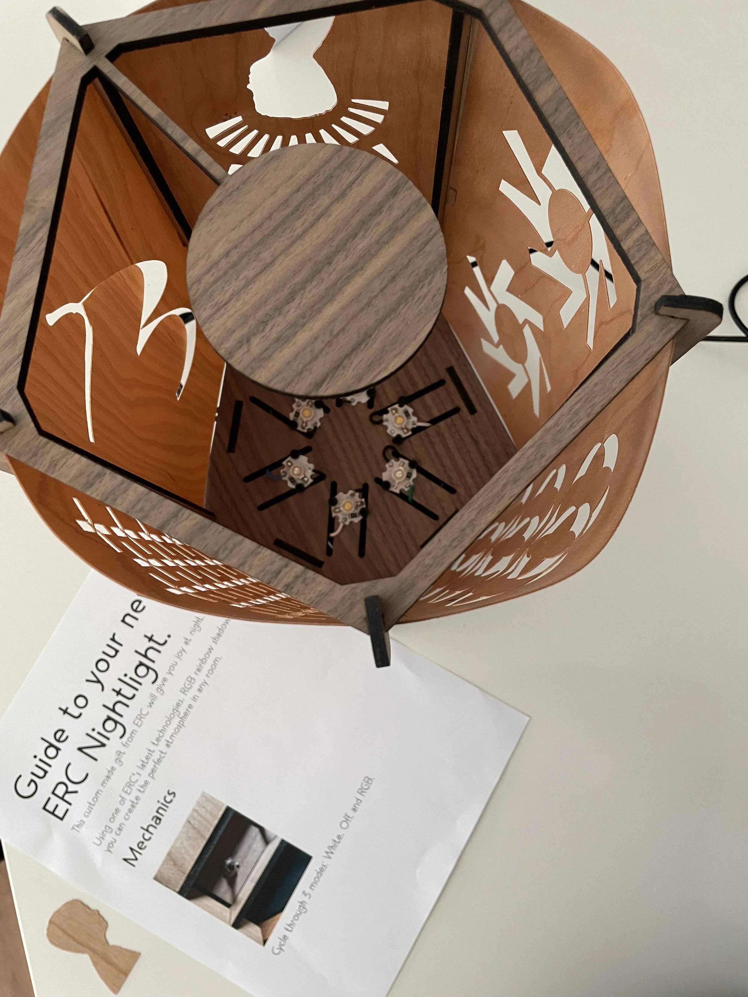 Inside the night light, you can see six LEDs, half colored (red, green, and blue) and half white projecting out onto seven designs. These seven designs are: my signature, a silhouette of my face, two abstract designs, another sector of abstract designs, an abstract pattern of pluses, and the final design. The final design is slightly more complicated, when the lights aim onto a solid circle at the top of the night light, they cast shadows in a Venn diagram shape showing the mixing of cyan, magenta, and yellow to create the colors red, green, blue and black.