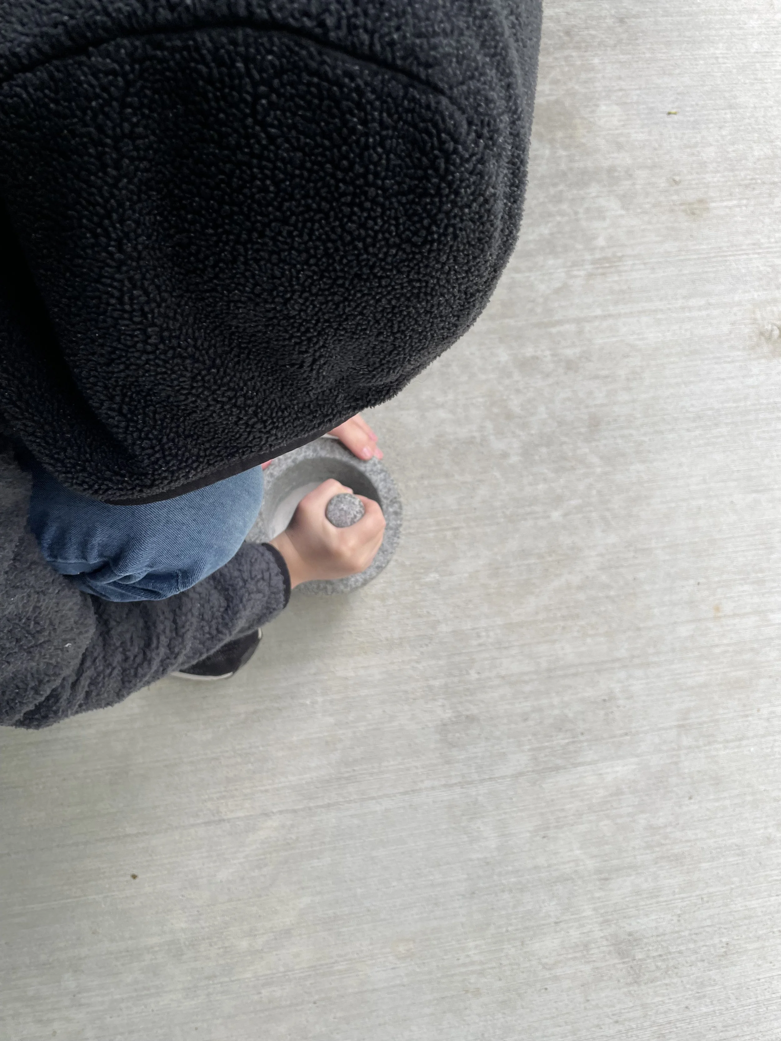 When grinding pigment, you use a device called a mortar and pestle which chops the rocks into a powder. You want to get the powder finer than flour in order to use it as paint.